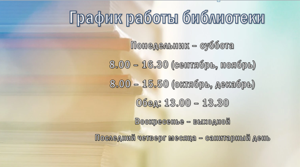 1.3. Режим работы библиотеки обозначен Правилами внутреннего трудового распорядка. В целях поддержания необходимого санитарно-гигиенического состояния фонда и помещений в библиотеке ежемесячно проводится санитарный день.
