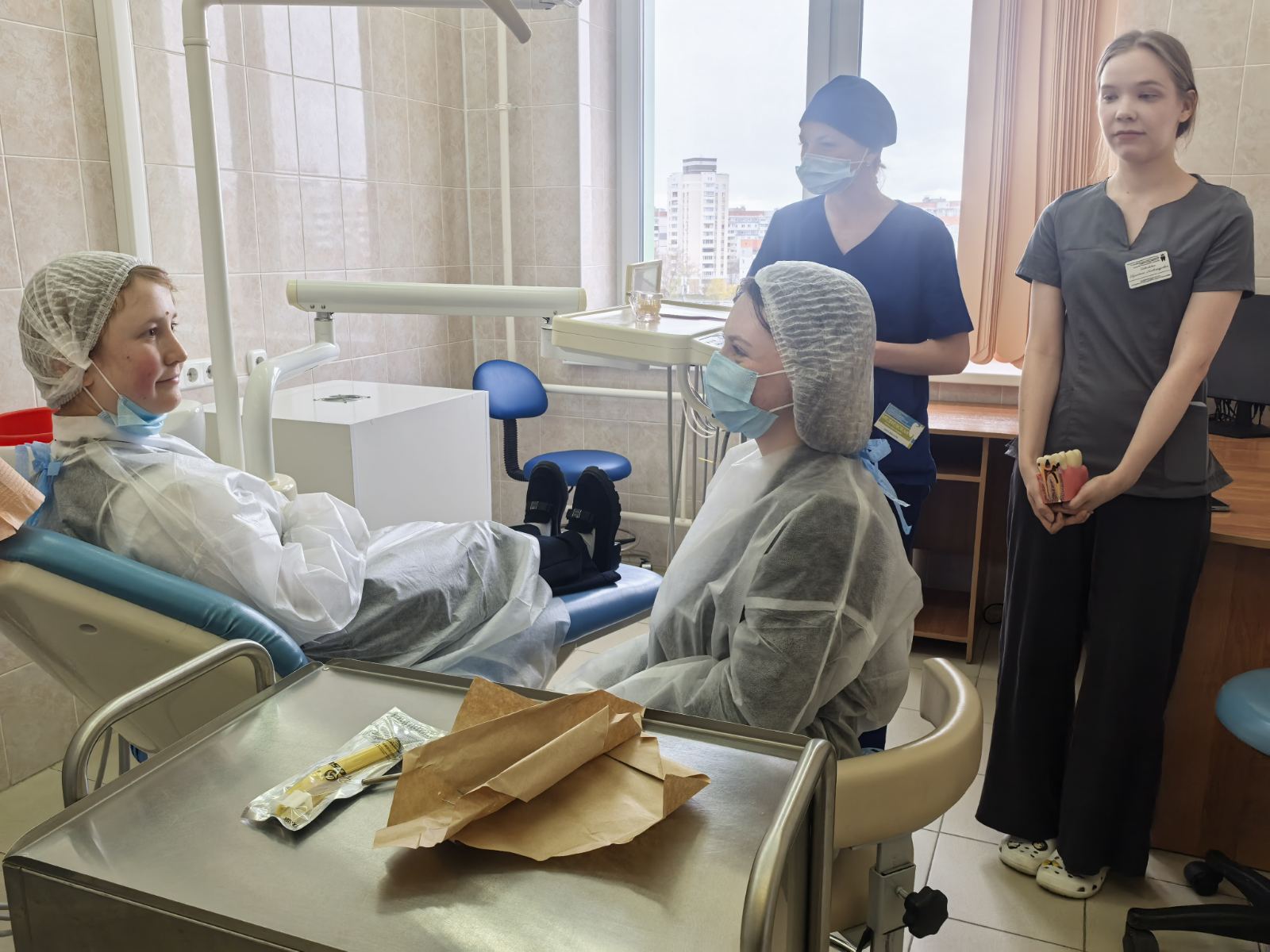 Особый восторг у школьников вызвала возможность примерить на себя роль стоматолога. Врач-интерн Медведская Я.В. и молодой специалист, медицинская сестра Павловская К.С. с удовольствием делились опытом и отвечали на многочисленные вопросы. Встреча прошла под девизом «равный обучает равного»: интерны ещё недавно были такими же учащимися и прекрасно понимают, что волнует будущих абитуриентов. Ребят особенно интересовали сложности поступления в медицинский вуз, нюансы учёбы и первые впечатления от начала профессиональной деятельности.