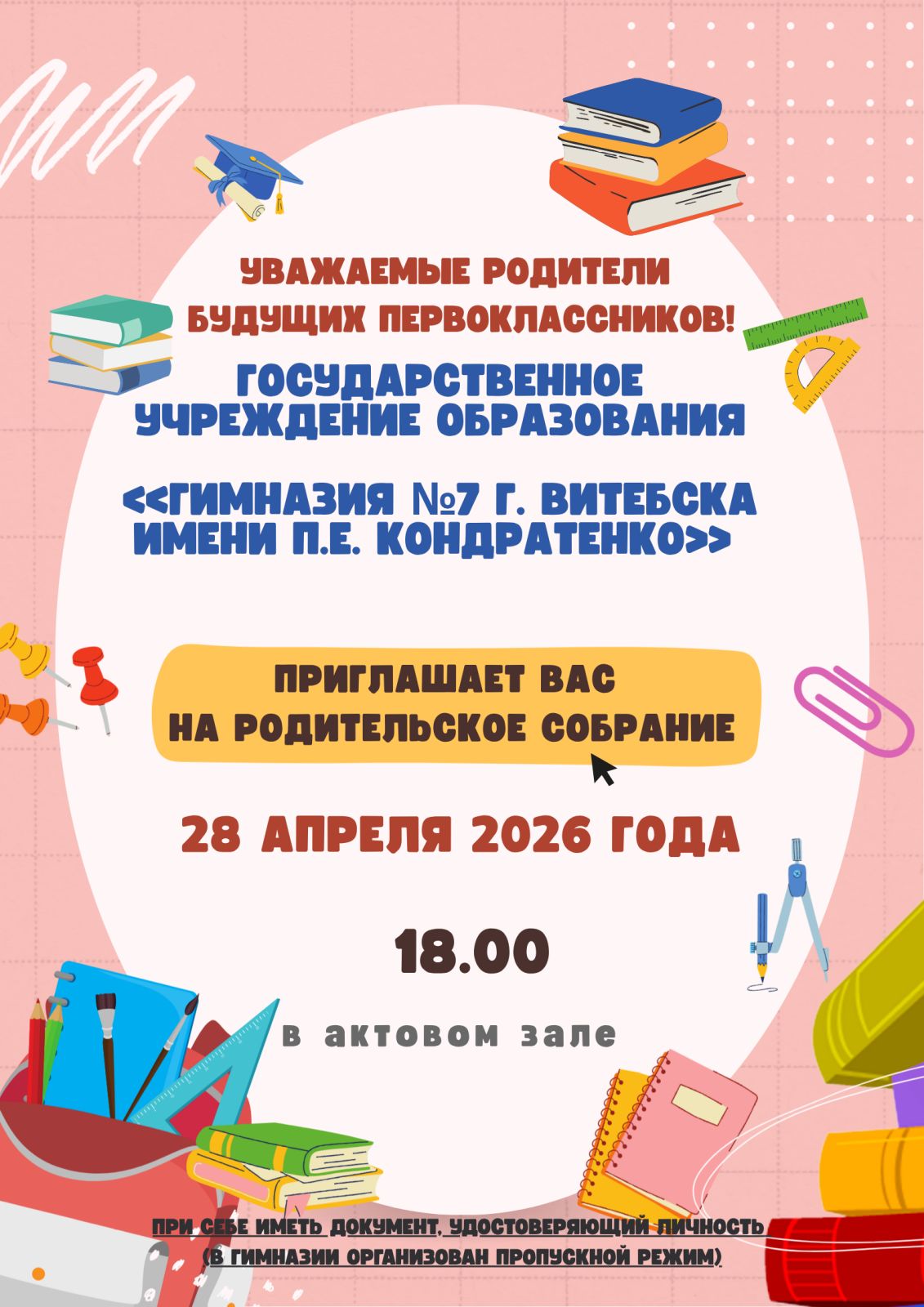 Государственное учреждение образования «Гимназия №7 г. Витебска имени П.Е. Кондратенко» приглашает ВАС на собрание, которое состоится 28 апреля 2026 года в 18.00 в актовом зале гимназии.
